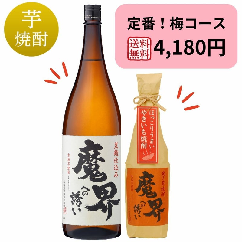 【セット内容】 黒麹仕込み 魔界への誘い 1,800ml 焼き芋焼酎 魔界への誘い 720ml 【商品特徴】 ロングセラー定番人気の『黒麹 魔界への誘い』とお客様満足度ナンバー1の『焼き芋焼酎』をセットにしました。飽きのこない、口当たりの良い焼酎なので長く楽しんでいただけます。