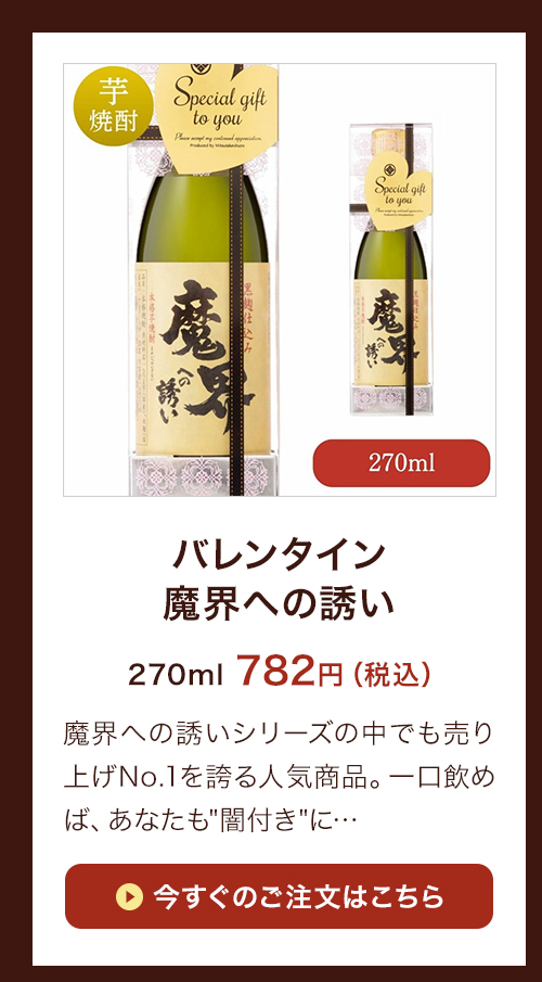 他の画像を見る バレンタイン特集! バレンタイン 魔界への誘い 270ml 専用クリアケース入り (VA-1)【光武酒造場/佐賀県】【いも焼酎】【バレンタイン】 本店特別価格 ¥ 782 税込 お酒好きのあの人にバレンタインプレゼント! 詳細を見る お気に入りに登録する