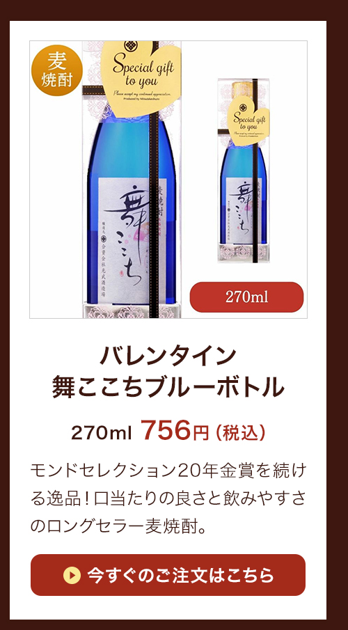 他の画像を見る バレンタイン 麦焼酎 舞ここちブルーボトル 270ml 専用クリアケース入り (VA-2)【期間限定 麦 ミニボトル 光武酒造 】 本店特別価格 ¥ 756 税込 お酒好きのあの人にバレンタインプレゼント! 詳細を見る お気に入りに登録する