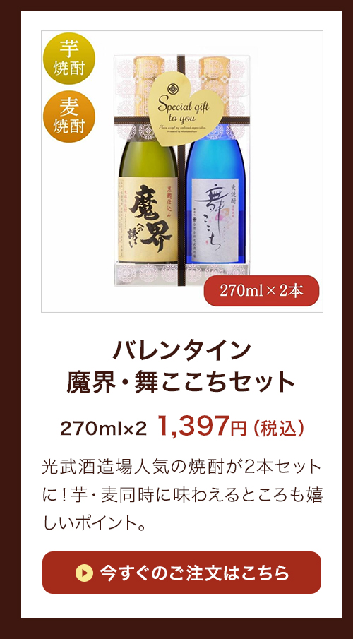 他の画像を見る バレンタイン 魔界・舞ここちセット 270ml×2 専用クリアケース付き (VA-3)【光武酒造場/佐賀県 いも焼酎 麦焼酎 むぎ バレンタイン】 本店特別価格 ¥ 1,397 税込 お酒好きのあの人にバレンタインプレゼント! 詳細を見る お気に入りに登録する