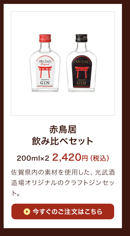 他の画像を見る 2種のジンを飲み比べミニボトルで登場!! Japanese GIN 赤鳥居 飲み比べセット 200ml×2 (オリジナル・プレミアム)(GIN-3)(小瓶)(※黒箱入り)(ポイント5倍)【飲み比べ】【クラフトジン】【スピリッツ】【光武酒造場/佐賀県】【ジントニック】【家飲み応援】 本店特別価格 ¥ 2,420 税込 詳細を見る お気に入りに登録する