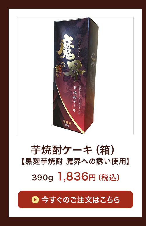 他の画像を見る しっとりおいしい♪ 芋焼酎ケーキ(箱)390g【黒麹芋焼酎 魔界への誘い 使用】【芋焼酎】【食品】【箱入り】【プレゼント】【自宅用】 本店特別価格 ¥ 1,836 税込 しっとりと焼き上げた新感覚の和風ケーキ! 詳細を見る お気に入りに登録する
