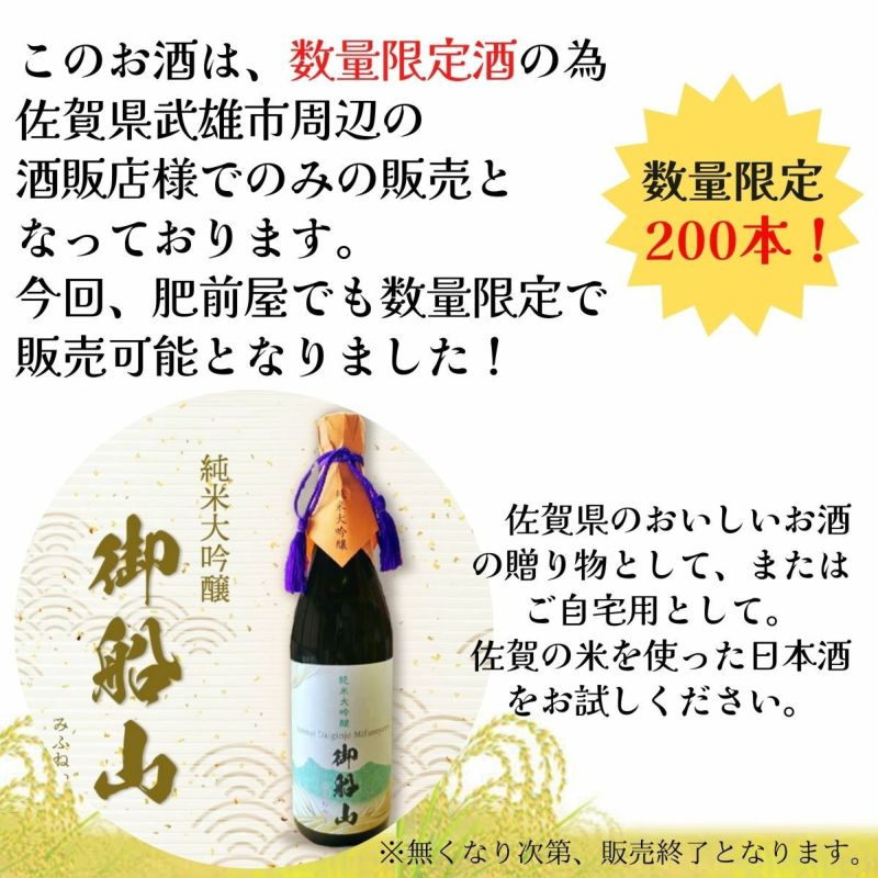 「純米大吟醸 御船山」は西九州新幹線をきっかけに より多くの方に佐賀の魅力を知って欲しい!佐賀に遊びに来て欲しい!と言う想いも込め、数量限定で造られたお酒です。