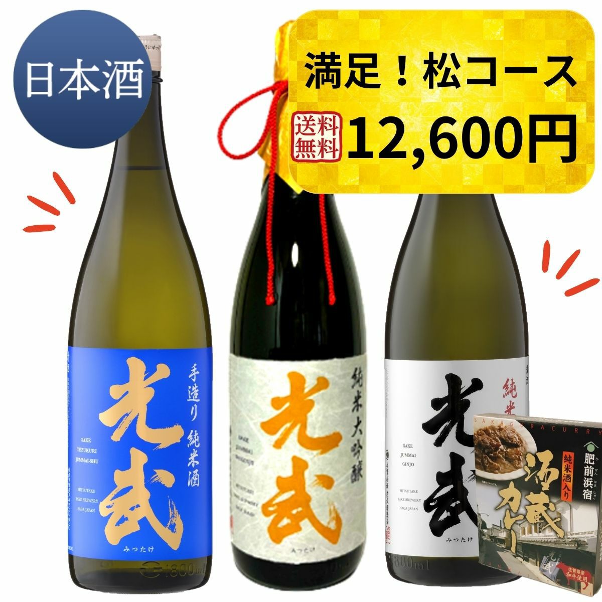 (送料無料・P5倍)定期購入(日本酒)松コース(純米大吟醸 光武1800ml、純米吟醸 光武1800ml、手造り純米酒 光武1800ml、酒蔵カレー)【定期便 お得 おすすめ 日本酒 清酒 定期購入 光武酒造場 佐賀】のレビューを書く