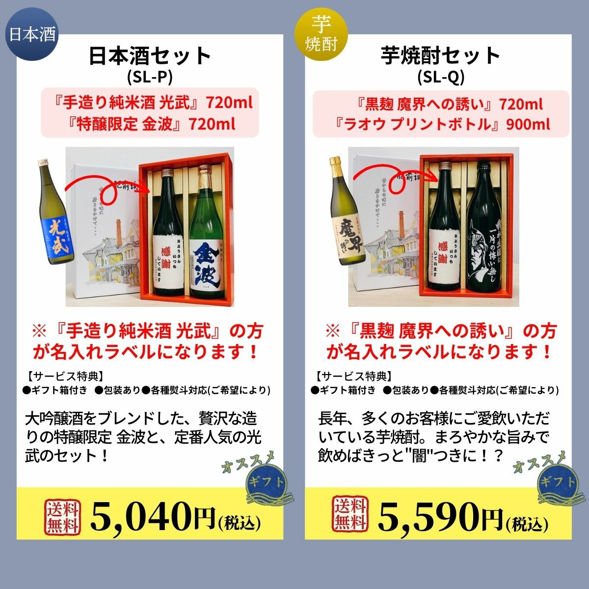 他の画像を見る 世界に一つだけの特別な贈り物♪ 日本酒セット オリジナル名入れラベル 720ml×2 (SL-P)(送料無料)(手造り光武、特醸限定 金波)【清酒 光武 お酒 セット 父の日 贈り物 プレゼント 記念日】【ギフト】【誕生日】【お祝】【お礼】【お歳暮】【お中元】【光武酒造場 公式通販/佐賀県】【肥前屋】 本店特別価格 ¥ 5,260 税込 光武酒造場を代表する銘柄の『光武』と『金波』のセット!飲みやすく、米の旨味やコクがしっかり味わえる日本酒です。 詳細を見る お気に入りに登録する